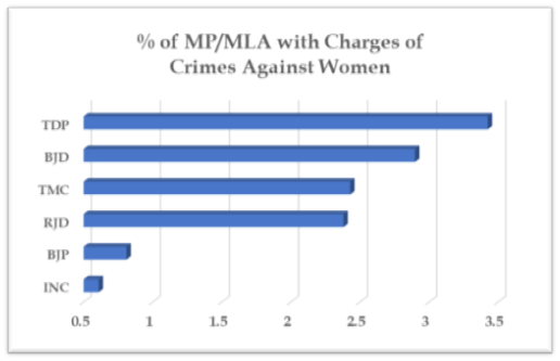 Coming to the topic of past crimes of political parties, let’s see where everyone stands, in this context. It has been said that BJP has the maximum number of tinted MPs and MLAs accused of crimes against women and children. Is that’s true – they have 14 out of their total 1700+ MPs and MLAs in the center and states, which is 0.8%. Congress is marginally better – they have 0.6% tainted MPs and MLAs. Let’s see the top few tainted parties.