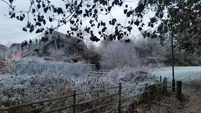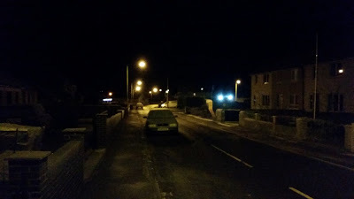 A 55 minute cold walk to collect the re-clutched car from the crazily inaccessible location of the repairer my insurer sent to rescue me, and still limping, and increasingly as the long march proceeded, from the effect on my left knee of the fall that broke my right arm three weeks ago; and as I held that fence to negotiate carefully a patch of ice, terrified of a further fall, a young girl following on from that group of schoolchildren seen here descending the stairs from the railway bridge ahead, said to me, "Oh bless your little cotton socks old fella, now watch you don't fall," but more in cheek rather than genuine concern, I felt. Thus I have become the butt of "old geezer" type remarks, of the sort, I admit, I have delivered myself, probably in the early seventies, perhaps not directly to the geezers concerned but certainly with a laugh amongst my young friends. Then I thought of what these children have ahead of them, probably, perhaps... the struggles, the challenges, the first times for so many new things, and I sighed, and felt glad that was all behind me, although two miles of icy roadway still lay ahead. I made it, little cotton socks and all, although darkness had descended by then.