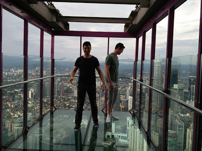 I took a wary walk across the Clifton Suspension Bridge, while the final two photos in this post show that my son - on the right in the glass box - had recently enjoyed his own high rise sights in Kuala Lumpur. Meanwhile my lady managed just a few yards along the Clifton Bridge walkway before deciding that was enough for her and retreating. She doesn't cope well with heights. Without any warning of their presence my son was highly alarmed to see bodies falling around him near the box - then parachutes opened... base jumpers from the top. The base jumpers were authorised, and they took the lift back to the top and jumped off again. Not my idea of fun.