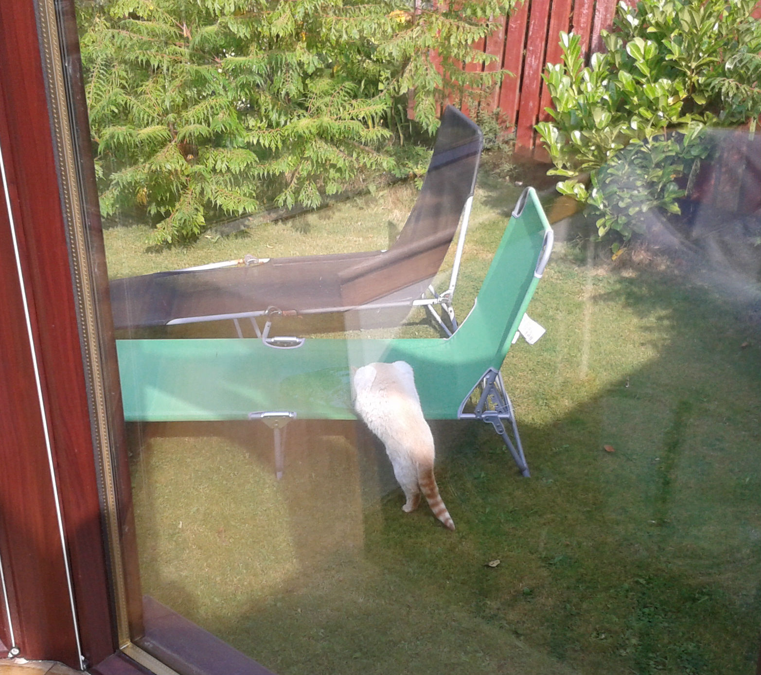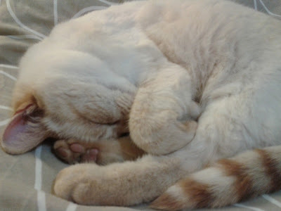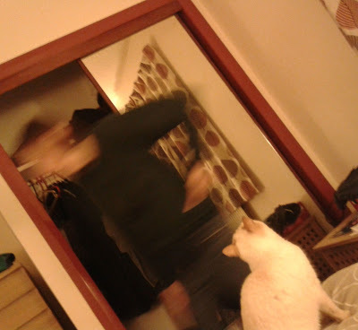 This is what can happen when teleporting goes wrong. Fortunately the cat was reuinited with her head eventually, although the wrong way round for a while, but all back to normal now.