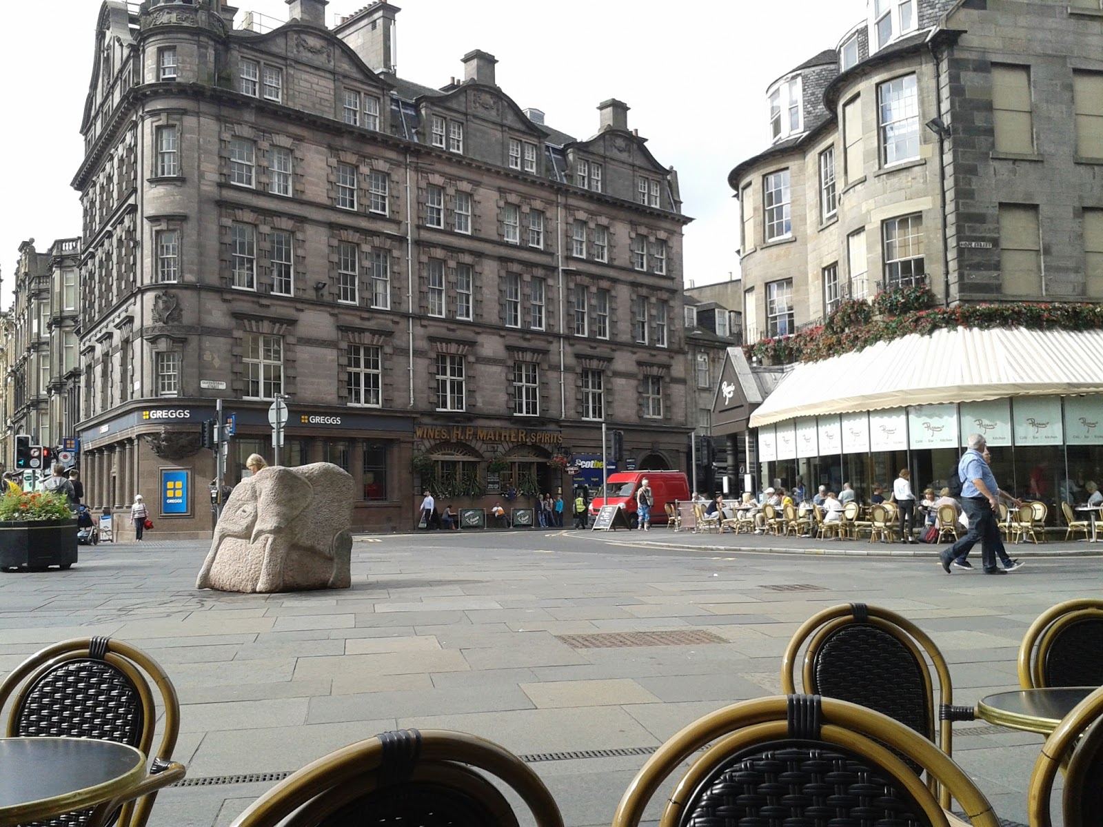 This West End corner of Edinburgh was looking and feeling slightly Parisian, I felt, on this uncommonly balmy September day, but full of contrast on closer inspection, with the grand old Mather's Bar now stuck beside Greggs the bakers, for goodness sake, while the man who "ate all the pies" is moving away to the right. And there is an oddly resting, or stuck, elephant in the room, or on the street, for which I came up with several apt Edinburgh and Scottish interpretations, as I supped my "Americano Classico", which was just a black coffee for goodness sake. Then the wind got up, an autumnal Edinburgh shiver ran through me, and I retreated back indoors to where the old dearies and tired gents were seated.