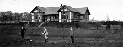 Around 1903, these fine fellows were about to play from the very spot where I now set out to play on my golf course, although the trees all around are all grown up now and that fine clubhouse burned down in the year of my birth, 1955, to be replaced by the new clubhouse still standing on that same mound. It gives me pause for thought as I set out, once again, to whack a little ball around the island.
