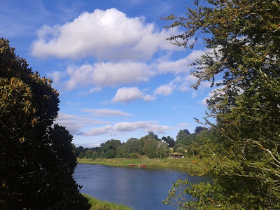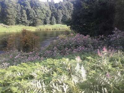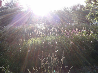 Look closely and you can just make out the river, which is actually very wide but it doesn't look so here. The golf is done, the beer has been supped, the sun is setting and the air is full of wild flower scent. Us two old fellows wander back along the narrow path toward the bridge, talking gentle nonsense and mild gossip, and everything is pretty damn good as our little place in the world tips backward from its sun.