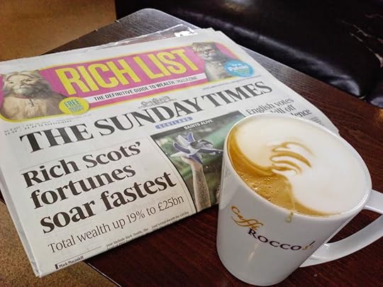 First, while all is quiet (although something is stirring outside), I can enjoy a large latte artistically signed off by a lass who insisted it was an accident (possibly a miracle?) because she's "useless at that"... and I can take time out to see if I have made it into the "Rich List" yet...
