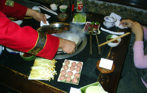 Entering the restaurant, I follow behind the girls wondering what is about to happen with a rising sense of concern. The first thing I notice is that the table has a hole in it about the size of a washing-up bowl and a gas burner underneath. A large stainless steel basin divided into two halves is brought in and placed carefully in the hole. One part of the basin has a white broth with vegetables and half a fish in it. The other part contains a dark crimson soup with a million chillies or ‘la jiao’ floating in it. There is also traditional ‘Chinese medicine’ in there that looks like seed pods of some kind. The waiter then brings over a plate of maybe a quarter-kilo of thick bright red chilli paste loaded with seeds on a plate and scrapes the whole thing in too. The flame is then lit under the table and the soup remains boiling away throughout.