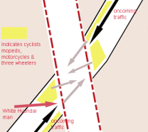 There is only one advantage of being first off the block but it’s well worth it. That is you won’t get tangled up in the chaos that occurs as both waves of traffic meet. You have to have your strategy nailed down before the starting gun goes off. I know I can beat Hyundai man but not the motorcyclists either side of me so I plan let the guy to my right go ahead and then cut in front of Hyundai man and use him as a rear guard shield.
