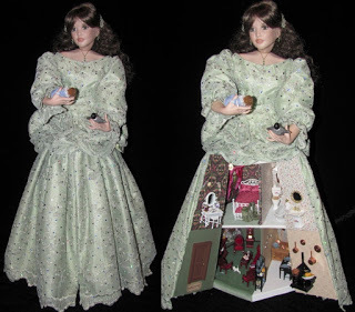 One of my favorite porcelain dolls I made was a Surprise Doll. It has a regular porcelain doll on the top, but the skirt base is made of wood with doors to open up to reveal a scene and is covered with the dress fabric. For a twist, I thought it would be fun to put a dollhouse inside of a doll. I love the way it turned out.