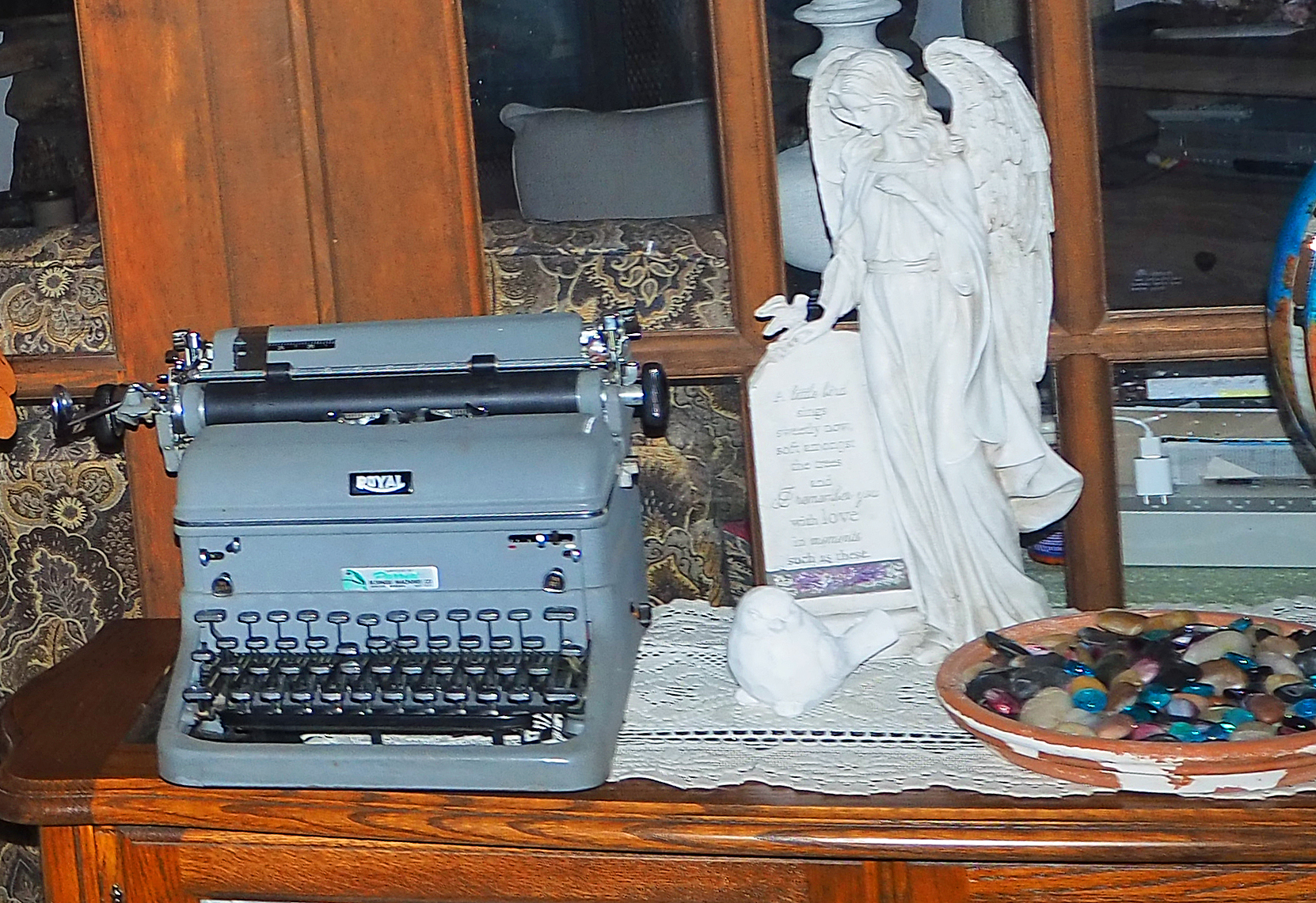 I moved my “office” from a corner of the bedroom in our then-very-small house to a corner of the living room, to a cottage on our property that we decided to rent out, so I moved back to a spare bedroom in the little house when one son moved out, then to a bedroom in our current home, then to a big office at our family business. We left the business, so back home I came – to a corner of the living room, then an area in the kitchen, then back to a spare bedroom that used to be a playroom for the grandsons – who are now grown. That’s where I am now. The above picture of me at a typewriter was taken when I first started writing in the corner of my living room, back around 1980. I had long hair and was a LOT skinnier then!