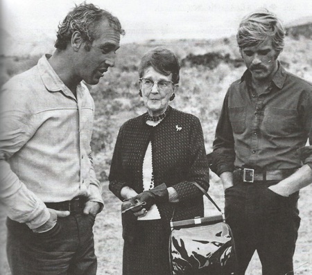 Lula (Parker) Betenson with Robert Redford & Paul NewmanThe ending of this book is so touching. Mr. Redford visits with Lula (Parker) Betenson, the 94-year-old sister of Butch Cassidy, whose real name was Robert Leroy Parker. (This visit would have taken place around 1975). There were 13 children in the Parker family, and Lula was younger than Butch, 6 years old when he left home. She saved all his letters and some of his personal belongings. Mr. Redford describes her as still beautiful, with eyes that showed her to be young at heart. They met at the old Parker cabin near Circleville, Utah. It’s kind of sad how he describes the old cabin at the end of his talk with Lula.