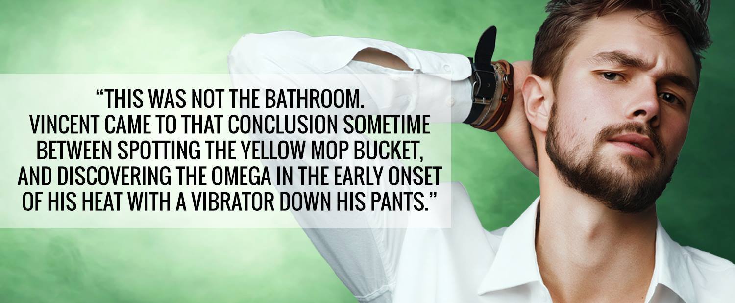 Once you parse through the badly written …whatever that is, you can somewhat ascertain that a man walks into a bathroom where an “Omega” (the one supposed to get pregnant by his alpha) is so “in heat” that he has to bang himself with a vibrator. It’s pretty gross this idea of dehumanizing someone. The concept of alpha male/ omega male is nothing more than the literary way of walking into a redneck bar with your boyfriend and a well-meaning but slightly inebriated associate asks, “Which one’s the guy and which one’s the girl?” And I think I’m being nice.