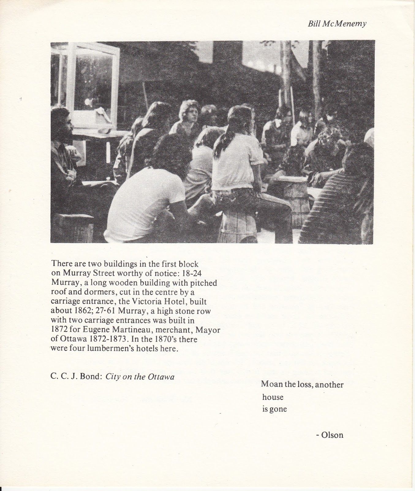 Subtitled “being a reading of poetry by various people, given in the back yard of the Victoria Hotel, 18 Murray Street, the Byward Market, Ottawa, on the evening of June 29th, 1972.”