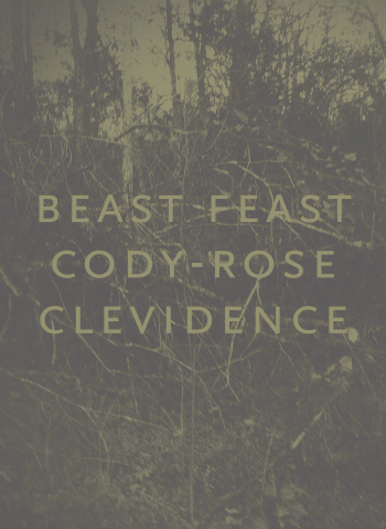 Perhaps a little late to catch what others might already know, I’m fascinated by the concordance of sound, space, language and punctuation in Cody-Rose Clevidence’s seemingly first full-length poetry collection, Beast Feast (Ahsahta Press, 2014). Very much constructed as a book-length engagement with nature, beasts, decay, language and etymology, Beast Feast is moss-thick and lively, animalistic and articulate, filled with a vibrancy and an expansiveness that runs and rushes the length and breath of the entire work. As Clevidence writes in the poem “{THEFT}”: “I is a single decomposure in the intermittent language.” Beast Feast is explosive in form, incredibly playful and serious in heft, displaying both an incredible precision and wild openness in a poetry book that, on first glance, appears to be structurally wild, and even unformed. The author even attempts to prepare the reader through the opening poem, a preface piece, set just before the table of contents, titled “BE PREPARED FOR MANY FORMS.”