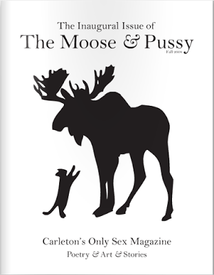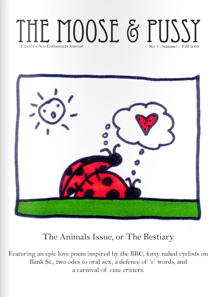 The Moose & Pussy #4: The Animals Issue, or The Bestiary. Summer/Fall 2009. Editors: Jeff Blackman, Jeremy Hanson-Finger, Kate Maxfield and Rachael Simpson. Editorial by Rachael Simpson. Sex You Can Read by Ben Ladouceur, Brendan Inglis, Bryan Borland, Calum Marsh, Chelsey Storey, David Brennan, Jamie Bradley, Julie Innis, Justin Million, Kate Maxfield, Kristel Jax, Leah Mol, Mark Burns Cassell, Mark Naser, Peggy Hogan, Samantha Everts, Shannon Rayne, shawn macmillan and Warren Dean Fulton. Sex You Can See by Becky Beach, Kristel Jax and Tanya Decarie.