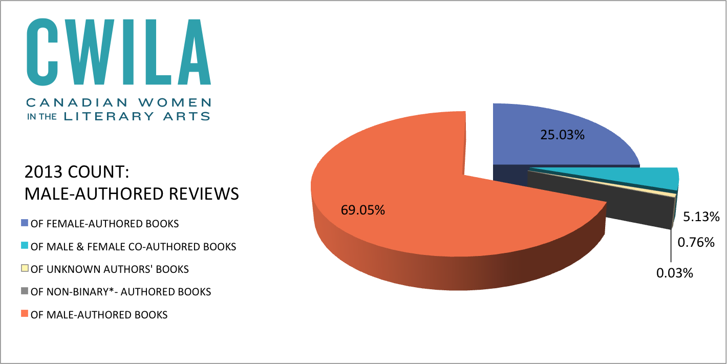 For example, as Ivan E. Coyote suggested in an interview with Tina Northrup in 2014, the “W” in CWILA is a contested space in a multiplicity of ways yet to be adequately considered. Last year, we added the category of “genderqueer” to begin to account for writers and reviewers who do not identify with the gender binary. This year, in consultation with trans women, trans, non-binary, and genderqueer writers and reviewers, we have refined how we present our data. We rely on the self-identification of writers and reviewers as well as the triple checking of pronoun usage to quantify data on writers and reviewers who identify outside the gender binary. And yet, this is only the beginning of the story. CWILA cannot hope to adequately address these issues or cultivate coalitions between woman-centred politics and gender critical politics more generally without writers and reviewers who identify outside the gender binary being actively represented within the organization itself on the board and in editorial positions. This, then, points to more risky and more urgent stories the numbers begin to tell. What will it take to continue to evolve CWILA into the kind of organization in which trans women, non-binary persons, women of colour, Indigenous women, and other severely marginalized groups want to take part? What will it take to feel as though we are truly working with a common purpose?