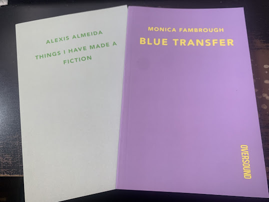 , most of which were producedthrough their annual chapbook manuscript competition: Monica Fambrough’s BLUETRANSFER (2020) and Alexis Almeida’s THINGS I HAVE MADE A FICTION (2024).Ithas been a while since I’ve seen any work by Georgia-based poet Monica Fambrough, back to her full-length debut, Softcover (Boston MA: NaturalHistory Press, 2015) [see my review of such here], although her author biographysuggests a self-titled chapbook appeared in German translation by Sukultur atsome point. There are such delicate, honed lines to the eight poems acrossFambrough’s BLUE TRANSFER. “my wedding ring / thin / as a mint,” she writes, aspart of the opening poem, “A SHELTER.” She manages lengthy stretches acrosssuch lively accumulations of short phrases, one line following another, carefullyset with an ease that is crafted, careful and clear. “Our children, / asleep intheir beds / arrayed like canapés / in their particular positions,” she writes,as part of the poem “MEXICO POEM IN TWO PARTS,” “holding in the still space /of time between / when you think / the baby will wake up / and when the babywakes up.” Her poems hold such a soft intimacy against declaratives, offering asequence of quiet, precise details. Or, as the first third of that same openingpoem reads: