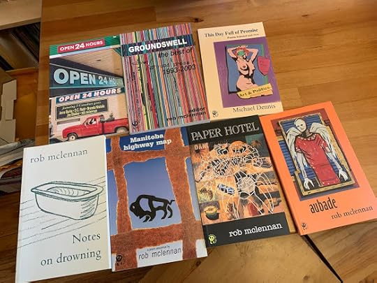 I recently garnered a few mounds of books from Broken Jaw Press (see my obit for editor/publisher Joe Blades here), including a handful of my own early titles that Joe published, as well as a couple of other titles I was involved with as editor. If anyone is interested, I am offering copies for sale.Notes on drowning (1998; my full-length debut!), paper hotel (2002) and aubade (2006) I'm offering for $7 each; Manitoba highway map (1999; my third trade collection) and the five poet anthology Open 24 Hours (1998; poems by myself, Brenda Niskala, Joe Blades, D.C. Reid and Anne Burke) for $5 each.