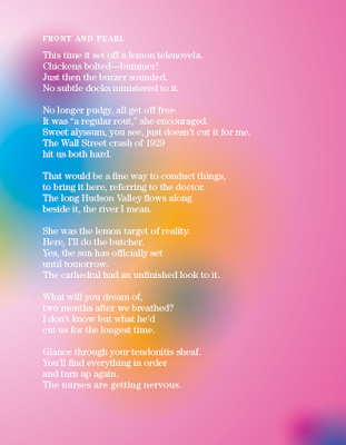 20 - What are you currently working on?I am working on some prose about food and Nova Scotia but it’s too early to say much. I’m editing my second poetry book, the one about the High Line Park. I am working on other poems now and then, and on an academic book about the emotional habits of slenderness.