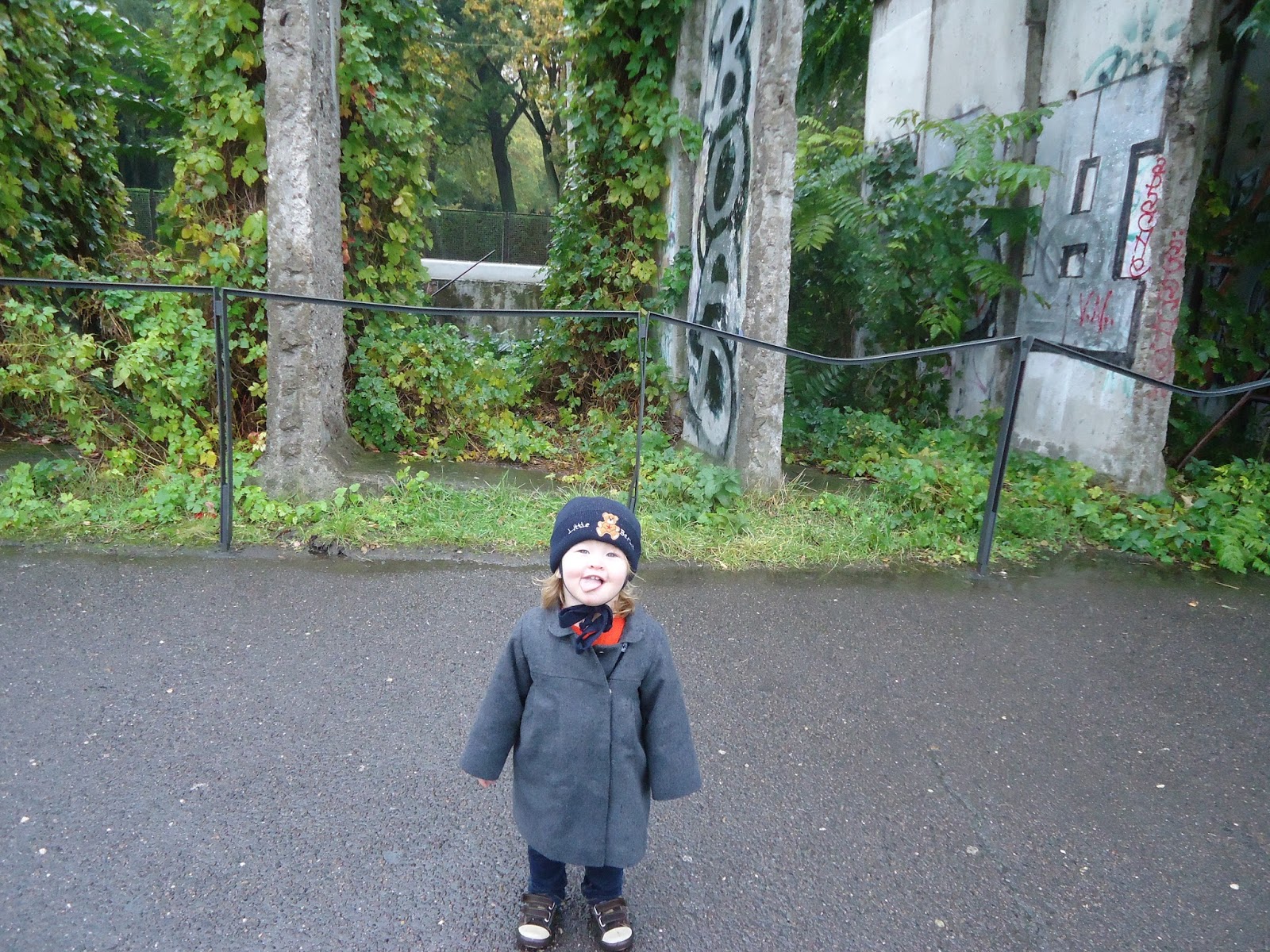 Curious, too: have there been studies done at all around those who left East Berlin once the wall fell, against a percentage of return? Certainly, the reasons for leaving might have fallen once the wall did, but the itch couldn't be helped; the desperation, one might imagine, too strong to consider any option other than escape. But after more than two decades, have any returned? Ten percent? Less? More? Any at all? The city still stands, with a population and people. Are they but the ones who remained? I'd be curious to know. We got a couple of pics in front of the wall, including ones where Rose would rather be stomping in puddles (the one with her tongue out is when I asked her to "smile").