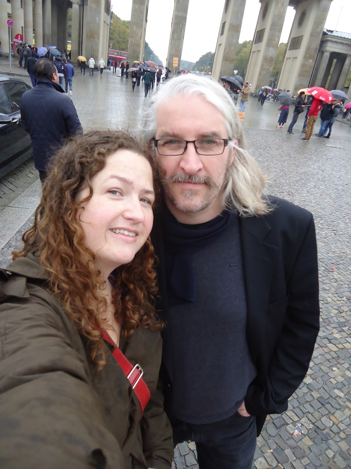 Thursday, October 15, 2015: Christine didn't have any conference until 11am or so, which allowed us to wander a bit towards downtown as a unit, heading north towards Potsdamer Platz to see what was what. Once our breakfast mess was cleaned, we headed toward the Brandenburg Gate (we got lost, slightly). It was raining, cold, but neither as bad as when Rose and I attempted the Berlin Wall; and the wee lass passed out asleep in the stroller, cold.
