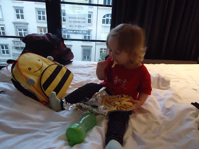 During our wanderings, I saw a couple of things on the street that amused me, but otherwise, it was a rather quiet day. It was getting too cold for the park, and the rain was starting to mist. Christine, as part of her conference, went to a reception of some sort, so, post-nap (and post-postcard writing), Rose and I eventually returned to the Turkish stand, where she enjoyed what we call "French Fries" (she repeatedly requested such from them), but they call "pommes" (pronounced "pomme-ez"). She was very happy in our little room.