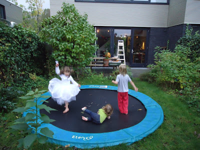 They have a trampoline outside, and once the older children became bored with it, we set Rose loose into the yard. After an hour of taking turns watching her bounce around, we finally had to drag her back into the house (outside was cold, rainy, etc) kicking and screaming. No, she screeched, more yard! But boy, she slept well.