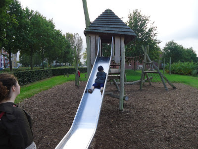 Monday, October 19, 2015: A day in which we attempted an outing. Did we? Postcards, a couple of groceries, and a walk to the park. A park which ended up being a school playground; apparently the Netherlands in the midst of their week-long fall break, which meant the school closed, and Rose could run around the otherwise-school equipment (she likes to slide down backwards, upon her belly).Found postcards. Mailed a package of things, including Touch the Donkey , over to Megan M. Garr in Amsterdam; she runs Versal , a magazine I've appeared in (but not for some time; I should really send some more work at some point). If only we'd had more time in Amsterdam. The benefit of staying with friends is the possibility of a few quiet days, which I think we've required, but it also means I haven't seen a thing in the Netherlands. Oh, but for the bicycles. So many bicycles.