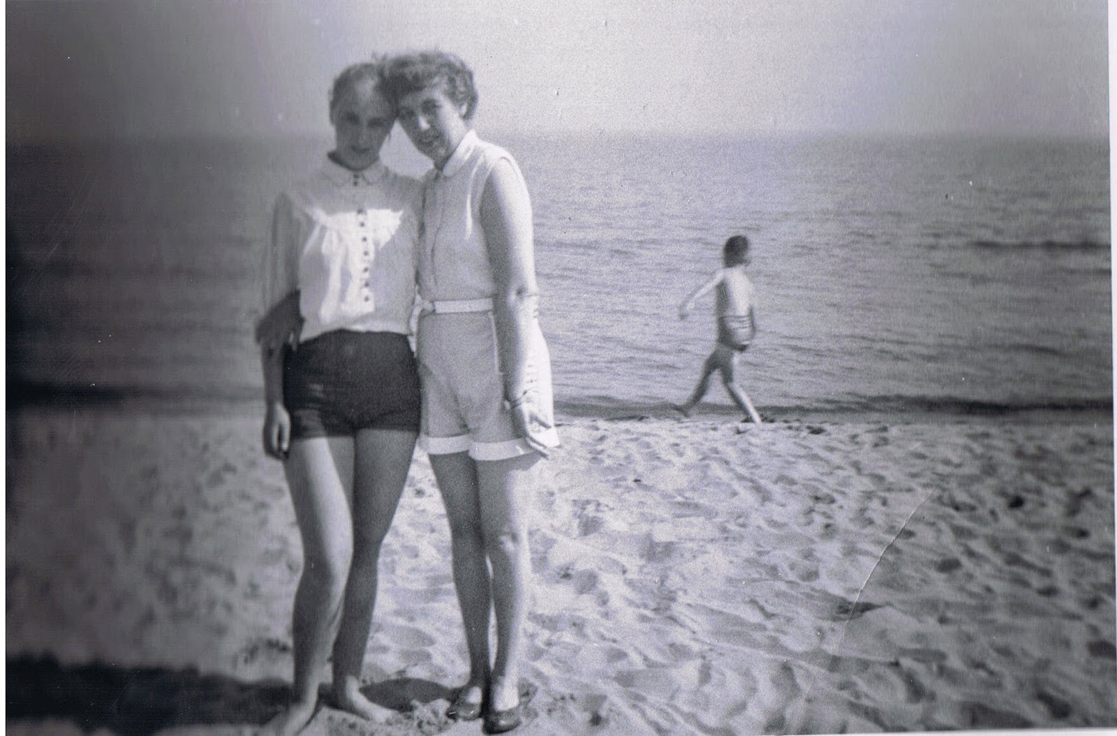 Here she is on the beach in Cobourg, Ontario with her mother, during the summer of 1956. Mum's youngest sibling, Bob, splashing about behind them.