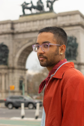 [Image Description: Headshot of a brown queer person, wearing a red-tan jacket, glasses, and a tied handkerchief. They are standing looking at the camera at a side with a slight smile. Behind them is the arch at Grand Army Plaza and a car passing by. ]