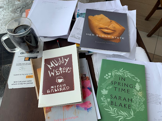 Covidstill has me low, so this is all I could get done for today.San Francisco CA: I’m appreciating theopportunity to go through further work by San Francisco (by way of Louisiana)poet and editor Micah Ballard, through his chapbook Muddy Waters (SanFrancisco CA: State Champs, 2022), a title that notes, according to thecolophon, has poems “written at Muddy Waters coffeehouse / in San Franciscobetween march and June 2022.” The author of a plethora of books and chapbooksover the past dozen-plus years, I’d been wanting to delve a bit deeper into hiswork, as he not only co-edited an issue of G U E S T [a journal of guesteditors], but has work in the next issue of Touch the Donkey [a smallpoetry journal]. Along with a preface by Garrett Caples and postscript byRod Roland, the twenty-five short first-person narratives in this collectionare composed as lines of accumulation, offering scraps of observation andimmediate moments propelled with an electric energy of narrative speed. The poemssuggest themselves as being timeless, but offer anchors to the immediatelycontemporary across fragments, scraps and moments that pose as larger narratives.As the opening poem, “CHILDREN OF THE NEW DAWN,” opens: “Very fentanyl / half aface, the other / diffused of light. Very Avedon / or Penati, a little Modigliani/ & off balance. Laughing gas under suspicion / cracking a nail on your zipper/ Everything I do is underneath.” Or, as the opening of Garrett Caples’ prefacepoem, “Muddy’s Report,” begins: “the coffee in this swamp / tastes much as you’dexpect [.]” These poems really are electric, charged with something I am stillworking to determine, but am enjoying a great deal, either way.