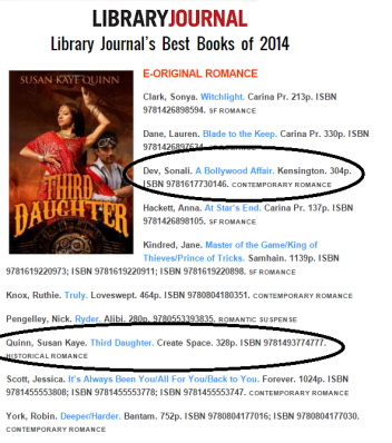 Sonali Dev and Susan Kaye Quinn met in a most unusual place: Library Journal’s Top 10 E-Romance List for 2014. Sonali’s A Bollywood Affair and Susan’s Third Daughter both made the list with their Bollywood-themed romances – something that was so cool, it cried out to be celebrated!