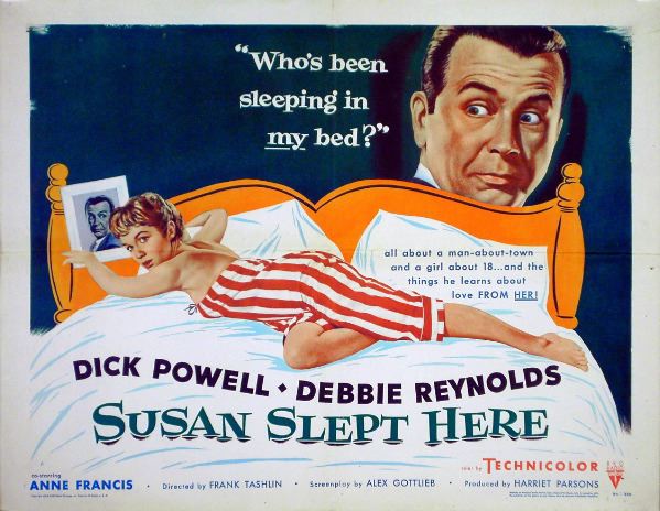 This delightful comic gem tells the tale of a grizzled screenwriter called Mark Christopher (Dick Powell) who ends up entangled with a female juvenile delinquent called Susan Landis (Debbie Reynolds) — some cops who are friends of Mark's have picked her up for coshing a sailor with a beer bottle. Recalling that Mark wanted to research a movie about teenage delinquency, they hook up the two of them.