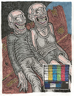 Trap House by Foul Apparatusbetween meat and pharmacy, four vaginas grew around the center of the large clock as its hands turned into scalpels. Blood leaked while the openings throbbed and stretched. Newborns were pressed out like meat from a grinder. Some were sliced in half, the tops dropping on the floor, the bottoms dangling from umbilical cords. A crowd of customers and workers gathered around the bizarre manifestation, screaming and crying, asking for the police or an ambulance. But there was nothing to save, no one to put behind bars. The newborns, even the whole ones, were already dead; or, as some witnesses speculated, trapped in a limbo between life and death not yet explored by medical science. Coated in mucus streaked with blood, the abominations had clumps of gray hair, patching their brown, shriveled heads. Their milky eyes stared vacantlyfrom folds of wrinkled skin like crumpled grocery bags. Brown mouths emitted a cacophony of sounds, from the shrill cries of a baby to moans, groans, and death rattles.Paralyzed fingers still held faded name tags or ID cards protecting their deflated chests. The insides of the ones cut in half by the blades of the clockwere yellowed dusty newspapers, rotten food chocked by ashen and green layers of mold, and slithering clumps of phone cords, electronic cables, and vacuum cleaner hoses. The morbid apparitions convulsed on the flooratrophied arms moving defensively as if their decayed minds flashed with savage beatings; stillborn trapped in an epileptic dance their parchment skin slapped and grimed the tiled floor. Theories abounded: zombies? curses? portals to hell? aliens?