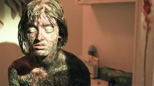 Rose and Samantha start by feeling cold and somewhat stiff. Green and brown blotches appear on their bodies for unknown reasons. Then they start pissing and shitting blood and their nails fall off. An especially effective addition to this list of symptoms is Samantha's eyes turning red and then one of them turning milky white. Just like the cum which infested her body, right there on her face, impossible to ignore, the sight of her morbid weakness.