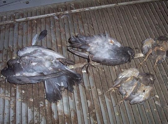 George threw the bag of dead pigeons in the dumpster. It dropped with a muffled thud.