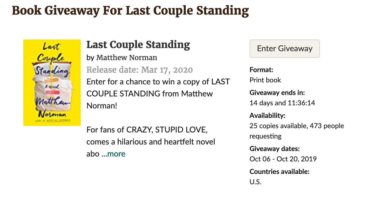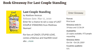 Hello, everyone. Some fun news for a Sunday afternoon. The lovely people over at Goodreads are giving away 25 advanced reader copies of Last Couple Standing.Sign up before October 20 for your chance to read it before anyone else. And, if you win, I'd love to know what you think.