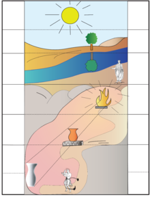 [image error] Allegory of the Cave. Left (From top to bottom): Sun; Natural things; Shadows of natural things; Fire; Artificial objects; Shadows of artificial objects; Analogy level.
