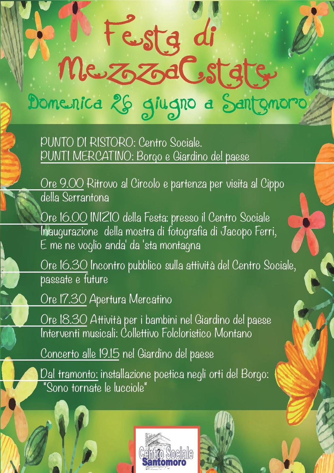 PUNTI MERCATINO: Borgo e Piazza della chiesaOre 9.00 Ritrovo al Circolo e partenza per visita al Cippo della SerrantonaOre 16.00 INIZIO della Festa: presso il Centro Sociale. Inaugurazione della mostra di fotografia di Jacopo Ferri, E me ne voglio anda' da 'sta montagna.Ore 16.30Incontro pubblico sulla attività del Centro Sociale, passate e future.Ore 17.30 Apertura Mercatino.