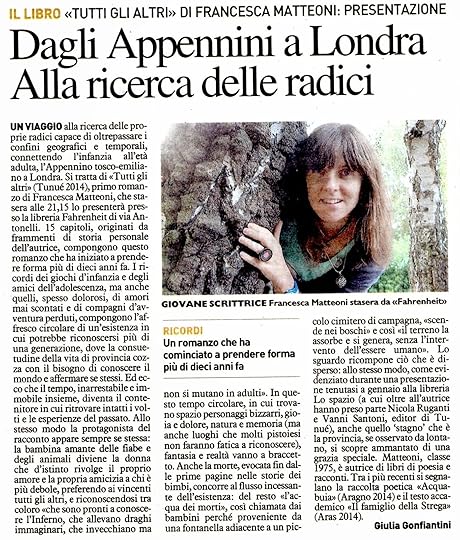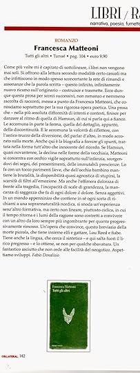 Poi per quanto riguarda le presentazioni di Tutti gli altri : domani 6 febbraio alle 19, sarò a Milano presso Il Mio Libro di Cristina di Canio, insieme a Isabella Mattazzi. Mentre sabato 7 febbraio alle 18 sarò alla Libreria Oblomov di Bergamo insieme a Francesca Genti.