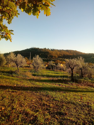 L'ora è pomeridiana, il pieno del sole prima del tramonto. A sud la montagna appenninica, con il suo crinale ammorbidito, eroso, appianato da secoli di vento. Mi fa pensare al Ben Bulben nell'ovest irlandese, che non c'entra molto, ma per qualche motivo un luogo conosciuto rimanda a un altro, con una forma di nostalgia e desiderio. L'ultimo mese si avvicina e, nonostante non ci sia traccia dell'inverno, la fine porta ancora la sua richiesta di colloquio intimo.