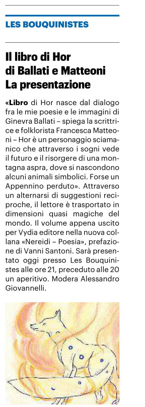 Riporto un po' di cose uscite in questi giorni intorno al "Libro di Hor". Su ReportCult a firma di Marta Meli è uscito un racconto poetico della serata di presentazione - con coniglio - del 10 gennaio 2020, che si può leggere qui.