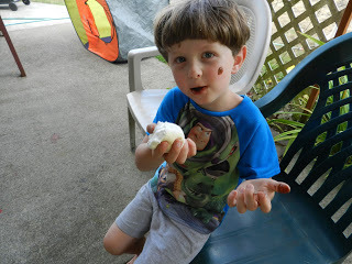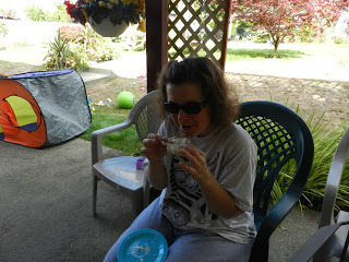 there's John asking me to help him because he has chocolate and marshmallow in his hair, on his shirt, all over his face, arms, and hands. I'm cracking up because I can't help him. I can't pry my fingers loose. I can't talk because my mouth is full, but I can snicker until I tear up, which is what I did. Not very pretty, but so much fun. Kid fun. Oh, and that is a zebra on my shirt. The back is the zebra's ass. I'll save the life inventory for deathbed homework and work on this right here, playing.Be cool and join Think's meme. That's all I gotta say on that.