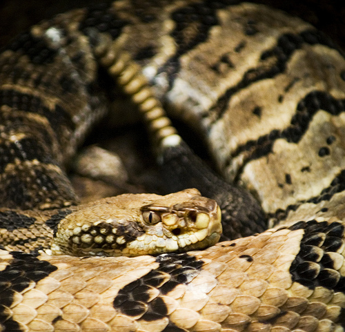 Then he saw the snake. It was curled around a rock, sunning itself lazily. Almost without thinking, Rafa picked up a stone and threw it at the reptile. He wanted to hit it in the head, but the stone fell about six inches short. The serpent flinched in surprise, and gazed around, seeking to discover its adversary. When it spied Rafa, it began to rattle its tail rapidly.