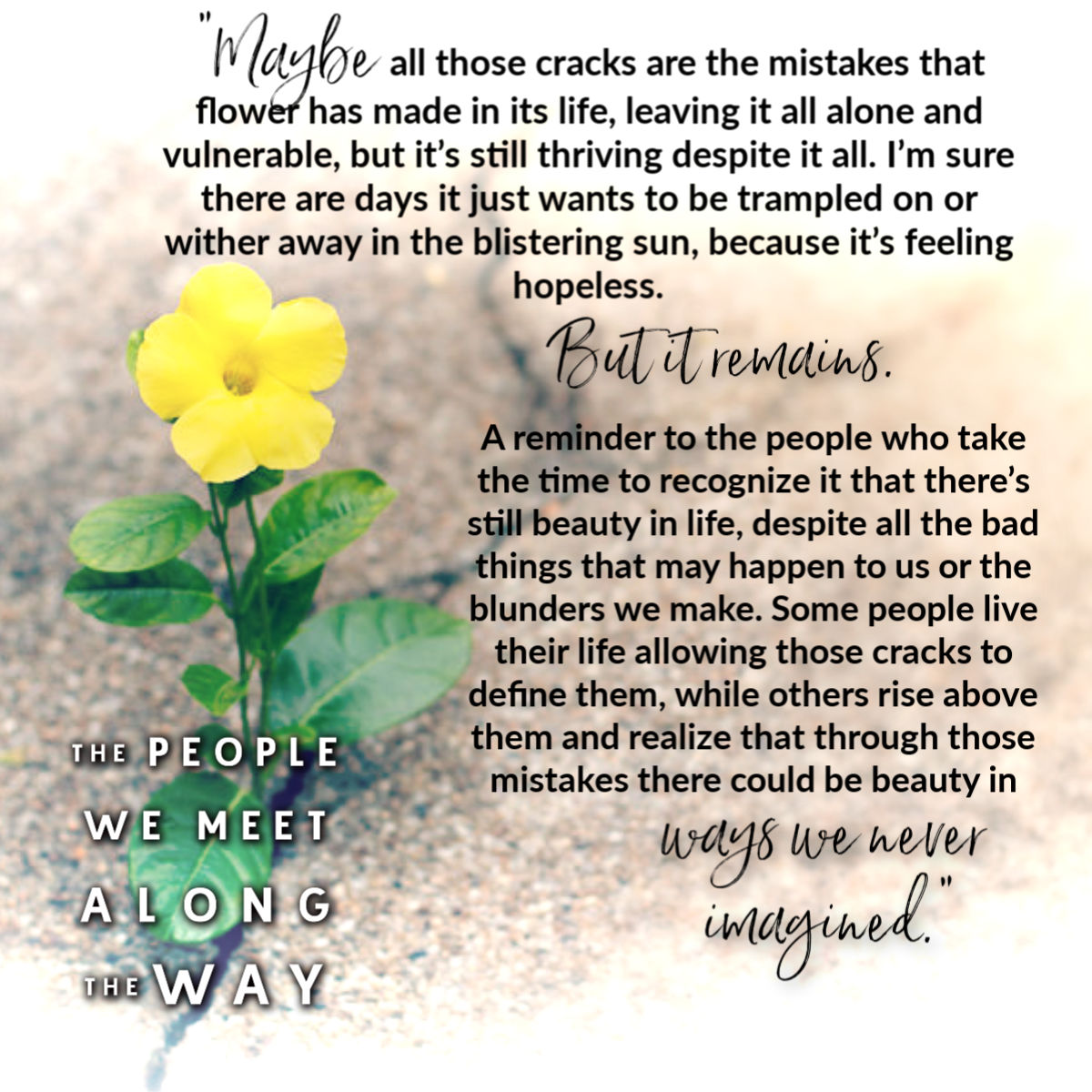 “Maybe all those cracks are the mistakes that flower has made in its life, leaving it all alone and vulnerable, but it’s still thriving despite it all. I’m sure there are days it just wants to be trampled on or wither away in the blistering sun, because it’s feeling hopeless. But it remains. A reminder to the people who take the time to recognize it that there’s still beauty in life, despite all the bad things that may happen to us or the blunders we make. Some people live th eir life allowing those cracks to define them, while others rise above them and realize that through those mistakes there could be beauty in ways we never imagined.”~ The People We Meet Along The Way