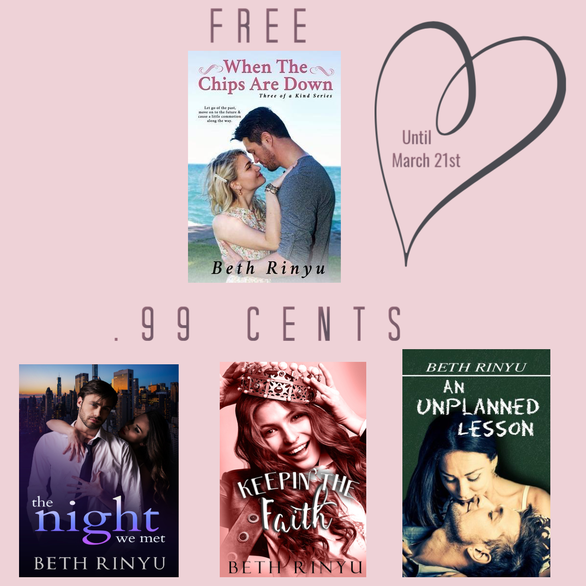 Happy Monday! Hope everyone is staying safe and healthy. In case anyone needs to escape the craziness out there, I've put three of my books on sale for .99 cents and one for free until March 21st. Grab your copies today