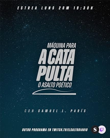 A Catapulta é o programa que realizarei en directo nas canles de Twitch e Youtube de El Salto e no que conversarei con poetas e xente vinculada coa poesía sobre a súa labor creativa, como se organizan, o seu día a día, a súa relación co mundo editorial e co público, etc. Con tranquilidade (Samu, es consciente do que dis?), pero co desenvolvemento que cada punto precise. E, ollo, tamén falaremos un pouco do que nos pete, porque falar é así: pensas que vas ir por un lado e “PUM!” acabas noutro lado sen saber como chegaches aí, como se se activase unha catapulta (que ben traído!).