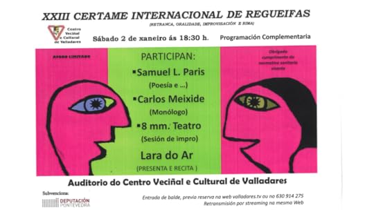 Comezamos o 2021 forte! O 2 de xaneiro estarei o CVC de Valladares, en Vigo, a partir das 18.30 facendo parte da programación do XXIII Certame Internacional de Regueifas, no que será unha sesión complementaria a todo o que é le competitione avec la regueifisma e que contará tamén con Carlos Meixide, 8mm Teatro e coa presentación e recital de Lara do Ar.