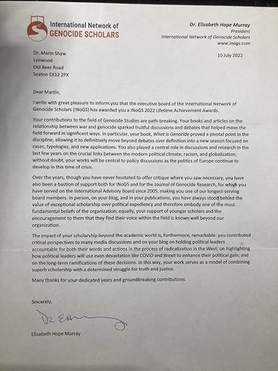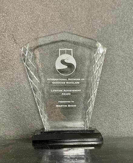 Readers may recall that in March, the International Network of Genocide Scholars informed me that they were awarding me a Lifetime Achievement Award. I’ve received one or two other awards in a long career, but this is the first with a physical embodiment, as the photo shows. Unfortunately I was unable to attend the INOGS conference last month, so this arrived in the post.