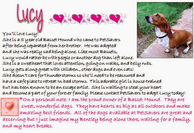 She is a 5-year-old Basset Hound who came to PetSavers after being separated from her brother. He was adopted and she was really sad being alone. Like most Bassets, Lucy would rather be with people or another dog than left alone.