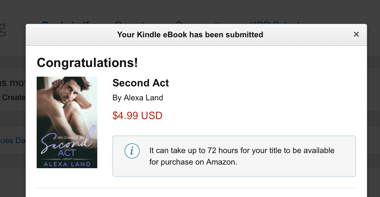 Second Act was uploaded to Amazon last night (April 28th) and now it's just a waiting game to see when it goes live. I'll post the link here as soon as it's available.