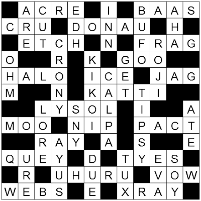 1 40% of a hectare (4) acre5 Afrikaans boss (4) baas7 French vineyard (3) cru8 1910 Kentucky Derby winner (5) Donau9 A-sketch (4) etch11 Type of grenade (4) frag15 Viscous, sticky stuff (3) goo16 On an angel's head (4) halo17 Phase of water (3) ice19 American naval legal drama (3) JAG20 Batti Indian romantic film (5) Katti22 Melvins album (5) Lysol25 What the cow says (3) moo26 Quick drink (3) nip27 Sealed in blood (4) pact28 Of sunlight (3) ray30 Young cow (4) quey33 Knots (4) tyes36 South African music group (5) Uhuru37 Serious promise (3) vow38 Made by spiders (4) webs39 For seeing inside your body (4) x-ray